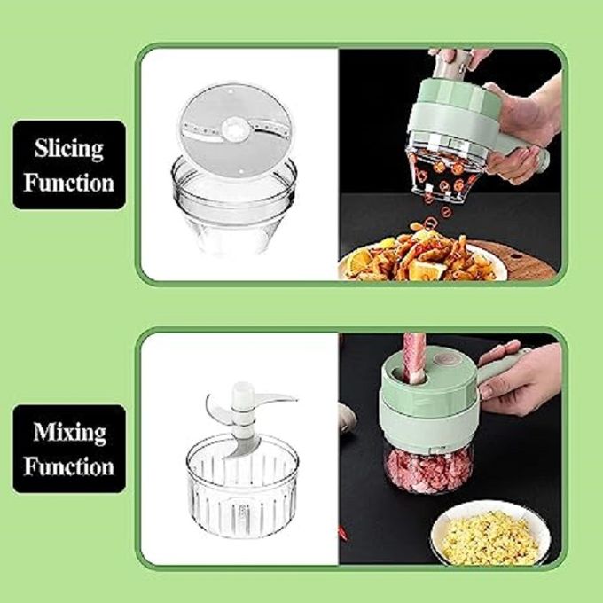 chopper devicetransparent container with rotating knivesfood pushing tooltransparent funnel with green lidstainless steel circle slicertype-C cable